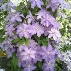 Unlike many pink varieties, Clematis ‘Sally’ won’t fade when grown in full sun – in fact the colour may even deepen! This strong growing cultivar bears an abundance of large pink flowers from May to September against a backdrop of bushy, mid-green foliage. A lovely choice for growing through roses and mature shrubs, but equally well suited to growing in a container on the patio. Height: 150cm (59″). Spread: 100cm (39″). Pruning group 3.