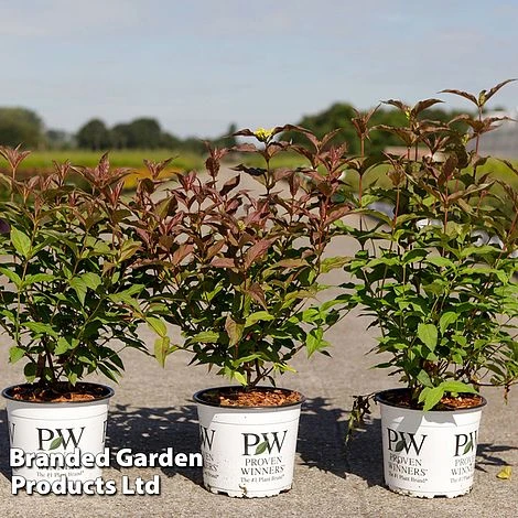 A very tough and reliable shrub that is valued for its bright spring and autumn foliage colour and is especially useful in partially shaded borders and difficult soils. It requires virtually no maintenance and is drought tolerant once established, adapting to almost any situation. Forms a bushy, mounding shrub covered in lance shaped leaves which are deep burgundy in the spring, maturing to green with red margins. In autumn the foliage turns vivid red. In early to late summer, it bears clusters of small tubular yellow flowers which are a magnet for insects. Grow as a single specimen, a low hedge or in massed plantings. It is also a popular filler for flower arrangements. Height: 90 -120cm (3-4ft). Spread: 120-150cm (4-5ft).