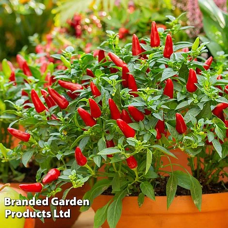 - Chilli Pepper ‘Fiery Flames’ – Numerous, 3cm long red chillies which are rated 100,000 on the Scoville scale making this an extremely hot chilli. Height: 30cm (12”). Spread: 30cm (12”).