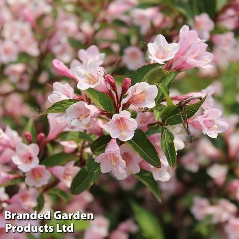 Apple-blossom pink blooms smother this bushy little shrub in early summer, standing out beautifully against its dark, bronze-green foliage. With a compact growth habit, this reliable variety makes the perfect deciduous shrub for small garden borders and patio pots. Weigela ‘Vintage Love’ is undemanding and easy to grow, requiring very little maintenance once established. A superb choice for a sunny spot where it will attract pollinating insects to its nectar rich blooms. Height and spread: 120cm (48″).